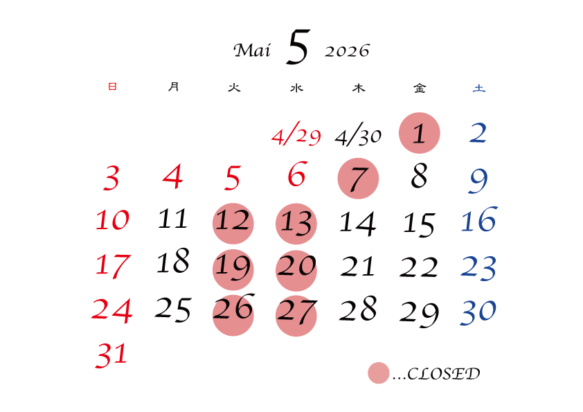 5月定休日のご案内MURATA2 日前読了時間: 1分いつもありがとうございます5月の定休日のご案内です※ 5日(火)こどもの日と、6日(水)は営業いたします。 1日(金)と、7日(木)がお休みとなります。